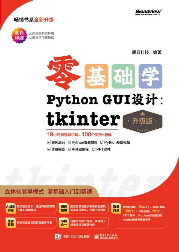 本书以开发Python窗口程序常用的tkinter模块为主线,全面介绍了使用tkinter设计PythonGUI程序的各方面技术。全书共分为18章,包括搭建开发环境、tkinter与GUI、tkinter窗口设计、tkinter布局管理、文本类组件、按钮类组件、选择列表与滚动条、容器组件、消息组件与对话框、菜单组件、进度条组件、绘图组件、事件处理、数据库操作、文件操作、Python程序的打包发布、掷骰子游戏、学生成绩管理系统等内容。